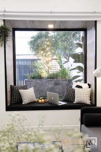 Cửa sổ kính trong phòng khách không chỉ là nguồn cung cấp ánh sáng chính cho khu vực này mà còn là nơi làm việc yêu thích của gia chủ.