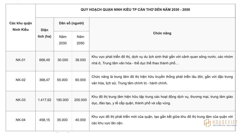 Quận Ninh Kiều được chia thành 04 khu vực quy hoạch: