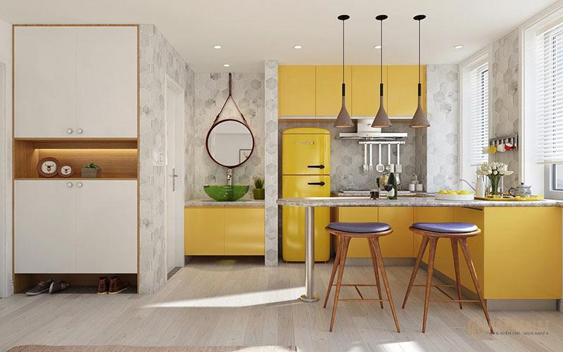 Gia chủ có thể kết hợp kệ bếp màu nâu sẫm và đèn ngủ màu vàng để nội thất căn hộ trông hài hòa mà không làm xáo trộn sự cân đối trong thiết kế.