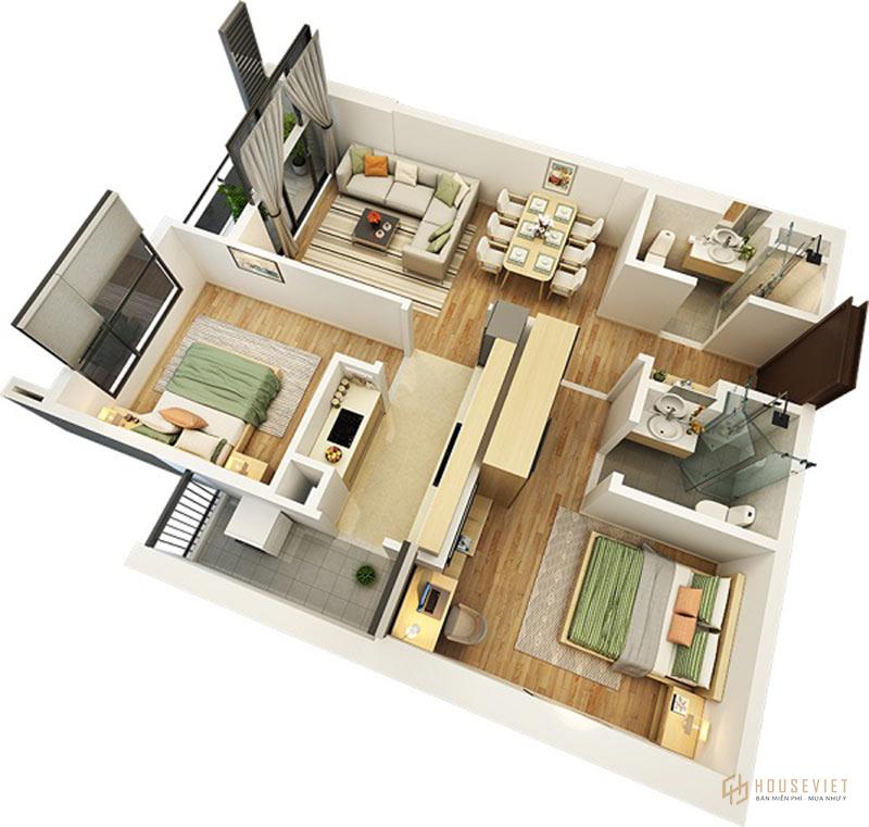 1.3 Thiết kế hai phòng ngủ lớn và một phòng ngủ nhỏ
