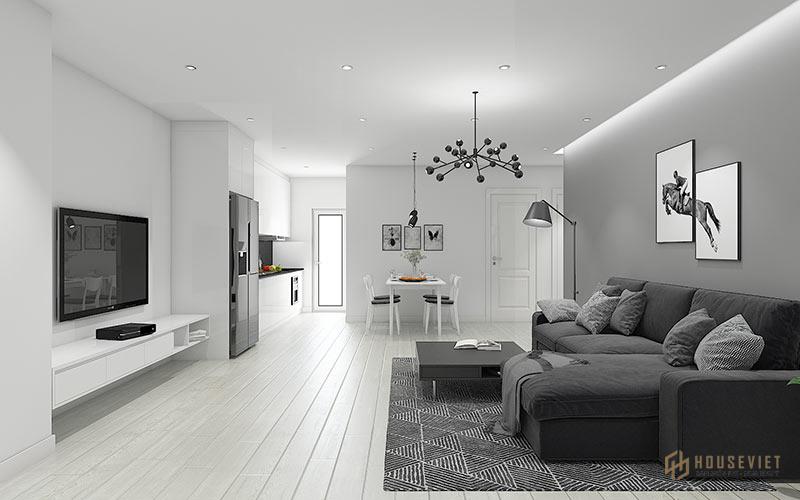 Thiết kế nội thất chung cư 3 phòng ngủ thể hiện sự sang trọng, cao cấp với tông màu lạnh. Một chiếc bàn ăn bằng gỗ hay một chiếc sofa xám cách điệu với thảm trải sàn là đủ cho một căn phòng thời thượng.